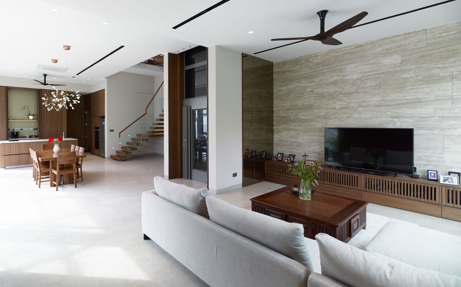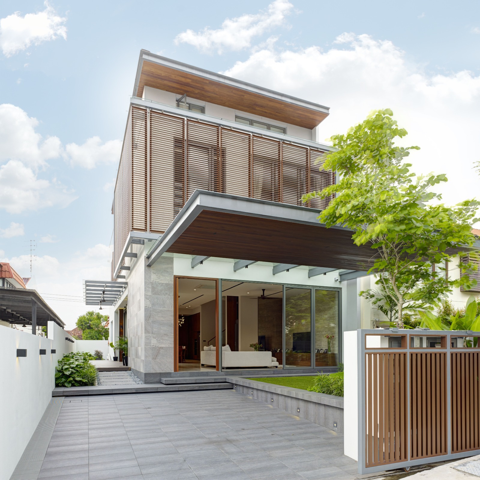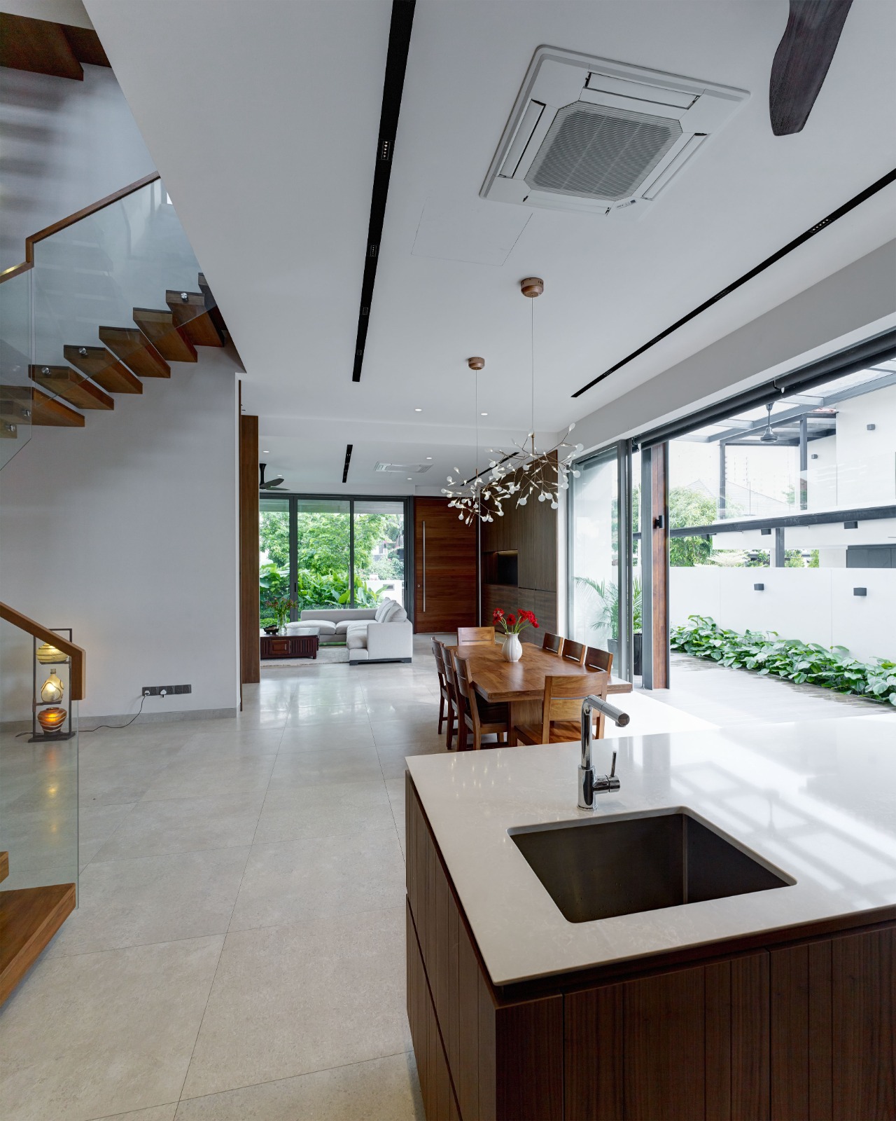 The design of the house dissolves the line between indoor and outdoor by extending spaces into the landscape and by redesigning walls and facades as porous and layered filters. On the 1st storey, extended cantilevered roof allows a seamless continuation of the interior spaces into the exterior. Internally, the private bedroom spaces are lifted into the upper levels and organised around a bright and lofty double volume family lounge. A light and floating angle stairs connect the volumes of the house. Large picture windows maximise views and promote air circulation while floating timber screens along the facades provides shade and privacy to the users.