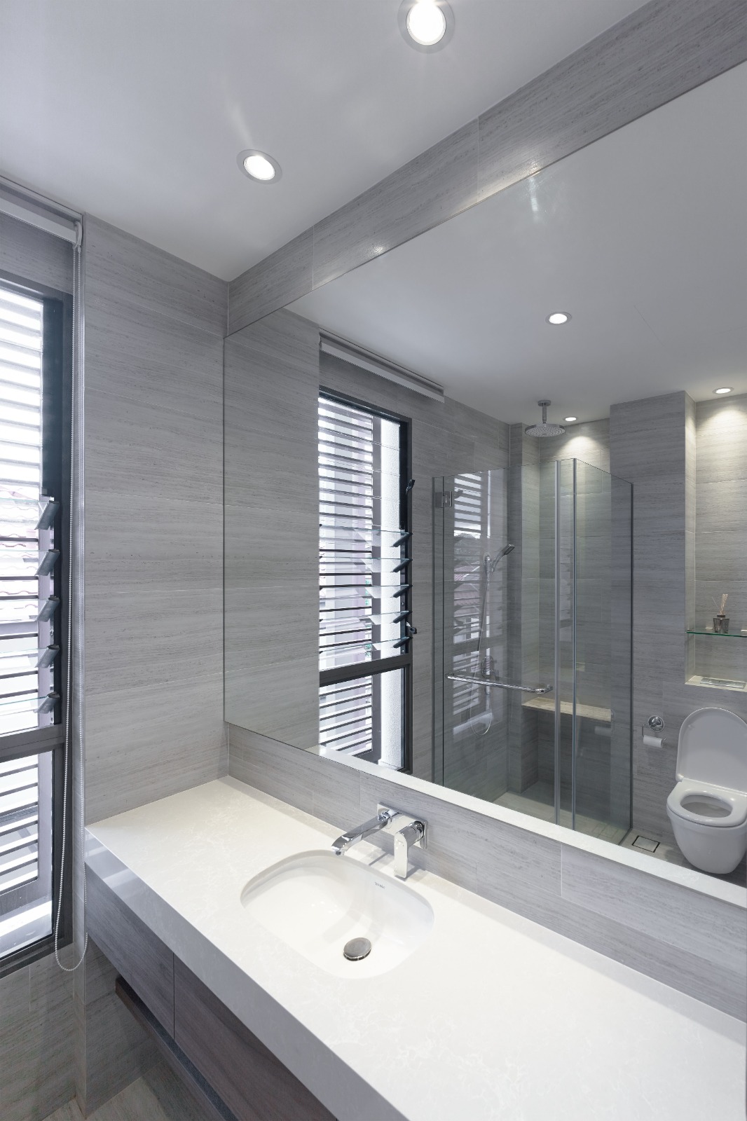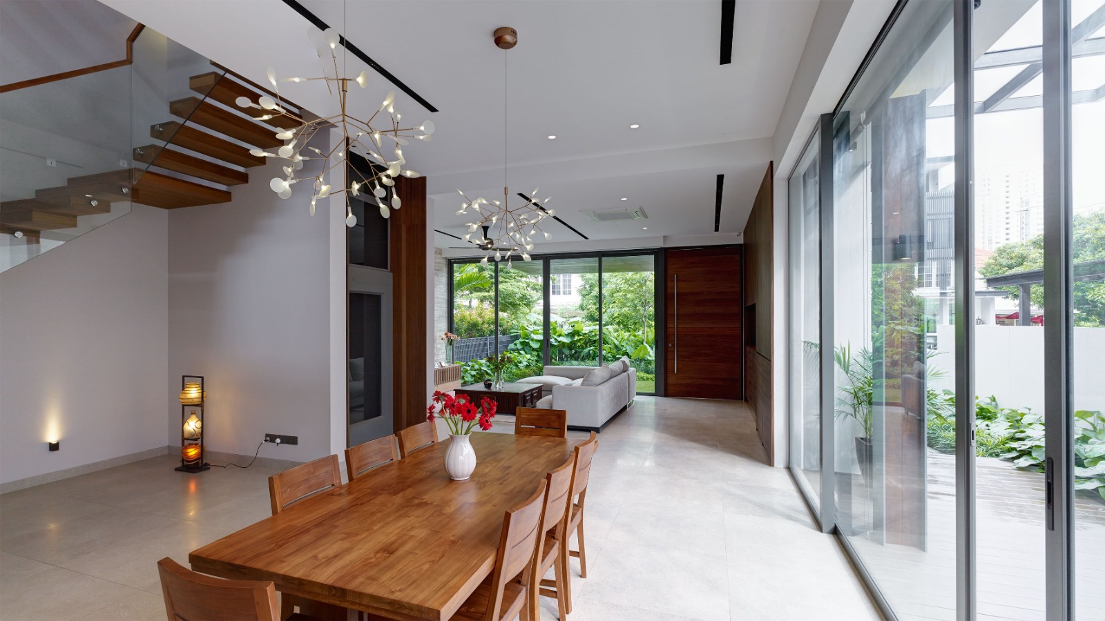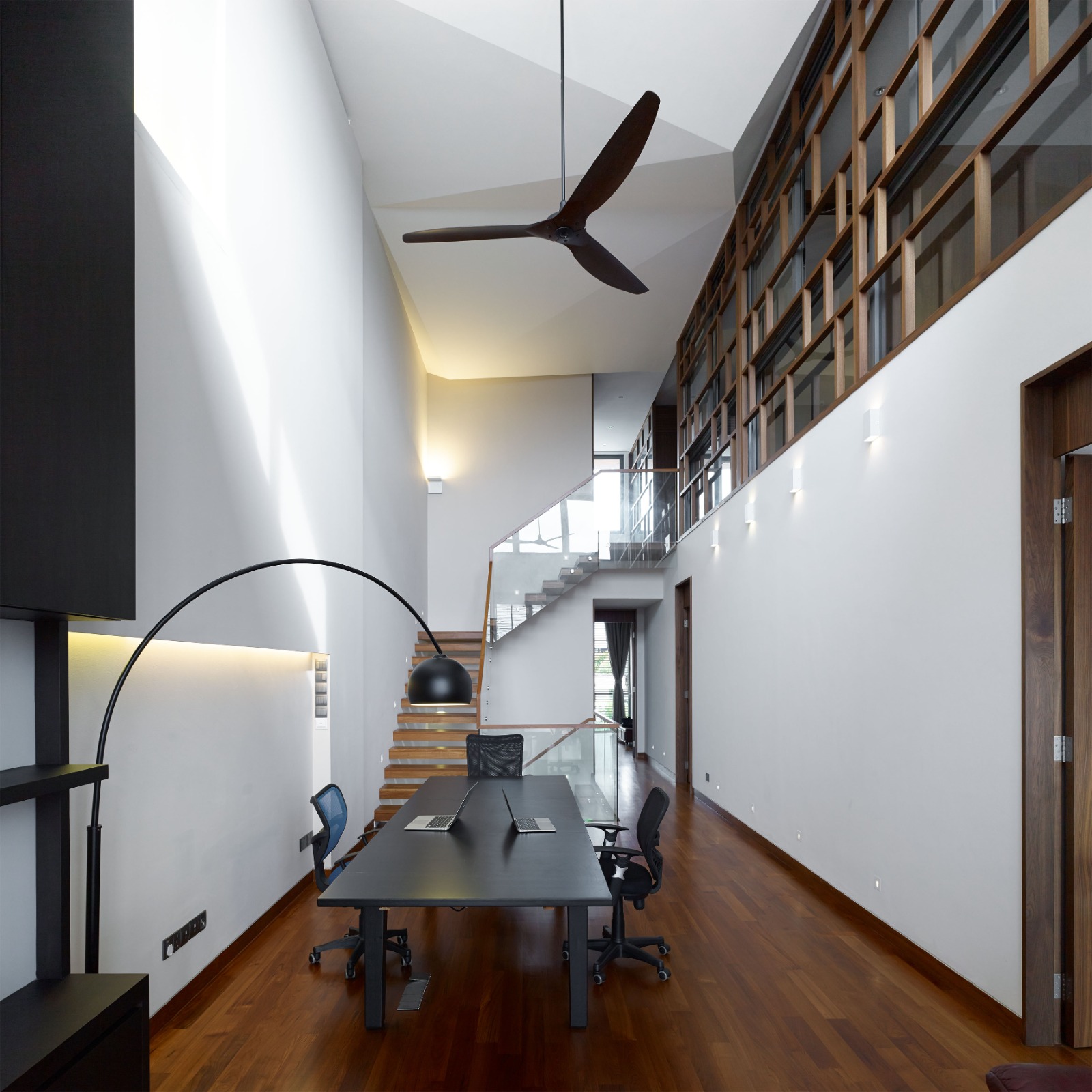 The design of the house dissolves the line between indoor and outdoor by extending spaces into the landscape and by redesigning walls and facades as porous and layered filters. On the 1st storey, extended cantilevered roof allows a seamless continuation of the interior spaces into the exterior. Internally, the private bedroom spaces are lifted into the upper levels and organised around a bright and lofty double volume family lounge. A light and floating angle stairs connect the volumes of the house. Large picture windows maximise views and promote air circulation while floating timber screens along the facades provides shade and privacy to the users.